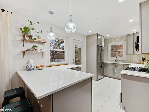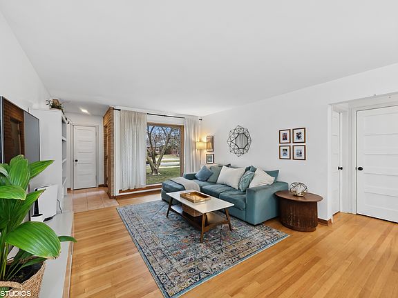 Step inside this adorable ranch and be wowed by the updates! The open-concept floor plan features hardwood floors, a living room with a sunny picture window, and an updated kitchen with gray cabinetry, quartz countertops, stainless steel appliances, stylish backsplash and peninsula with seating and gorgeous pendant lighting! Three bedrooms with ceiling fans and closet organizers and a full bath complete the main level. The huge finished basement expands your living space with a large recreation room, laundry room, plus an additional bedroom and a beautifully renovated full bathroom - perfect for guests! Outdoors, enjoy relaxing and entertaining on the large patio and private backyard with beautiful mature trees! SO much has been updated here - brand new water heater (2023), new AC/furnace (2022), sump pump, drain tile system, updated electrical panel, interior/exterior doors, many new windows, washer and dryer, the list goes on! Great location on a tree-lined street, close to plenty of restaurants, shopping, Centennial Park/Pool/Fitness Center, Metra, and easy highway access. School district 64/207: Franklin Elementary, Emerson Middle, Main South HS. Nothing to do but move in and enjoy this beautiful home!