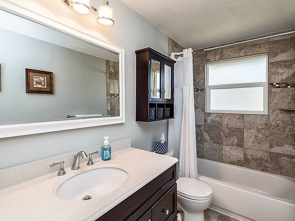 Updated home w/open Great Room layout. Dark rich flooring accents new kitchen island w/butcher block top. Wood burning fireplace is focal point in spacious living room. Newer windows, AC/Furnace, & Water Heater & front door. Bathroom completely updated w/tile shower. Large East facing backyard w/mature landscaping, custom built sandbox & RV parking area.