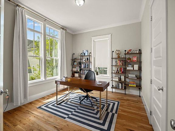 Welcome to 751 South, where modern living and timeless charm come together in one of Durham's most sought-after communities. From the moment you step onto the welcoming front porch and through the front door, this home invites you in with light, space, and thoughtful design. Just off the entry, an office framed by glass French doors offers the perfect space to work from home, study, or create. A full bathroom on the main level adds both function and flexibility for guests. Flowing further inside, the home opens up to a bright and spacious kitchen, where an oversized island, quartz countertops, and stainless steel appliances make both everyday meals and gatherings with friends a joy. The kitchen overlooks the living and dining areas, with sunlight pouring in through tall windows and a fireplace anchoring the space with warmth. The true highlight of the main floor is the primary suite, a serene retreat tucked privately downstairs. With a spa-like bathroom featuring dual vanities, a walk-in shower, and a generous closet, it's a space designed for relaxation and ease. Upstairs, additional bedrooms and living spaces create plenty of room for everyone. Step outside to your private brick patio, where morning coffee or evening grilling becomes part of your routine. And just beyond your door, the 751 South community offers a resort-style pool, clubhouse, fitness center, playground, and walking trails, all designed to connect neighbors and elevate everyday living. With its ideal Durham location, you're just minutes from Duke, UNC, RTP, and some of the Triangle's best shopping and dining. This home is more than a place to live—it's a lifestyle waiting for you.