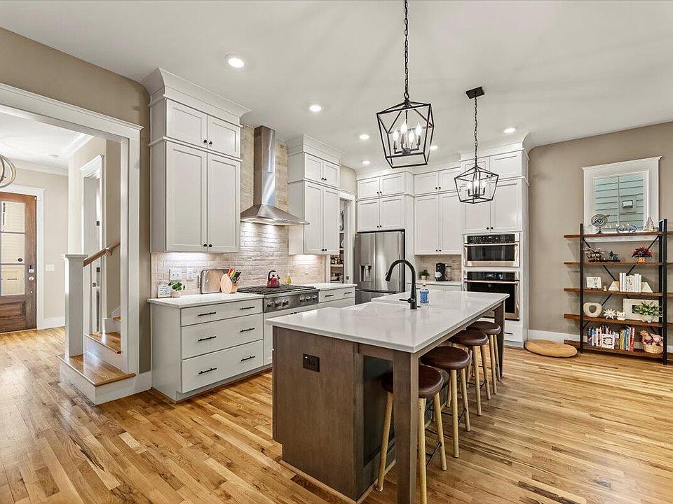 Private brick patioWelcoming front porchWalk-in showerBright and spacious kitchenOversized islandLiving and dining areasTall windows