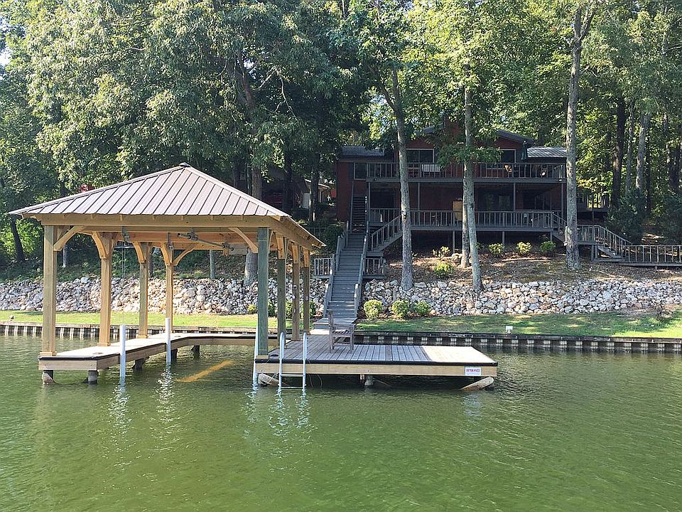 Fantastic full brick 3 bedroom/3 bath house with one level living located in Country Club Estates. The extra large master bedroom has two large walk-in closets, a sitting area, and an updated en-suite master bath with dual sinks and solid surface countertop. The second bedroom also has an en-suite bath. Beautiful tongue and groove paneling and marble tile flooring are found in the great room, dining area, and kitchen. The great room boasts a floor to ceiling brick fireplace and a cathedral ceiling that is supported by cedar beams. The updated kitchen features a breakfast bar, quartz countertops, soft close cabinets, and stainless appliances. Also included is an unfinished basement for storage and a detached two-car carport with a one-car garage and a large workshop. A covered boat dock with electric boat lift, electric PWC lift, and large covered deck completes this home made for family and friends to enjoy. Neighborhood amenities include a club house, pool, tennis court, park, and gated boat launch. This is what lake living is all about!