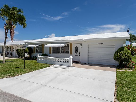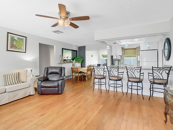 This lovely home in the 55+ community of Palm Beach Leisureville is tastefully updated. Engineered hardwood floors welcome you as you enter the main living area and large kitchen peninsula is perfect for entertaining. Other features include a 1-car garage, open living/dining area, Florida room, two spacious bedrooms, 2 bathrooms with walk-in showers, and spacious patios in the front and back. Palm Beach Leisureville is an active adult community with organized events as well as a clubhouse with a pool, event area, shuffleboard and golf. Conveniently located near I-95, shopping, dining, and movies.