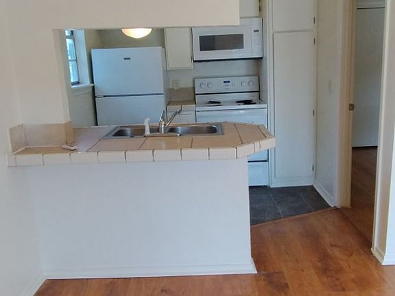 We have a 1 bed, 1 bath upstairs end unit with French doors to a balcony and the kitchen window facing the park (nicest unit in building). It was just remodeled with a brand new tub surround & faucet, newer plank floors, fridge and built in microwave. The kitchen has tile counters with an eat-up peninsula.