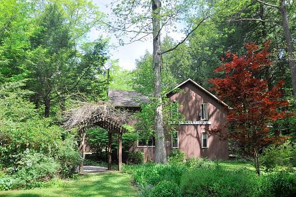 Tucked away on 9 wooded acres on a secluded Danby hillside,with a lovely creek outside your window.This multi-level contemporary has 3 bedrooms,2 full baths,and a mbr suite w/adjoining den/office.Owner recently added a fab office/fam room w/private balcony overlooking the rear garden.Vaulted redwood ceilings,Llenroc fp w/insert,built-in bookshelves & beautiful views from every window.An unparalleled setting for the nature lover and shade gardener.Wonderful neighbors.Kids attend ICSD: South Hill Elementary.Direct TV & broadband via Verizon 4G antenna-CL for details.