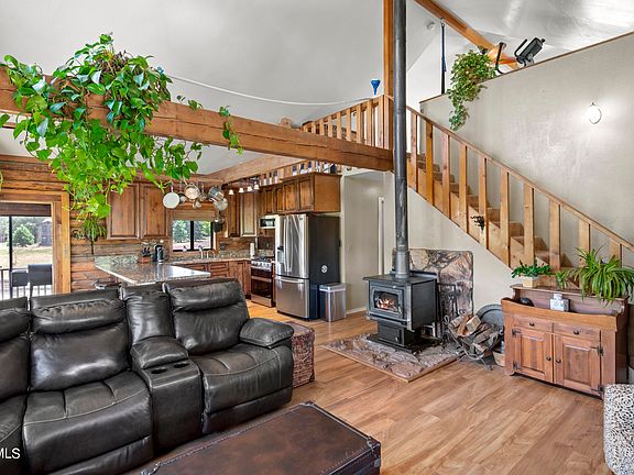 Log-Cabin Horse Property on a Beautifully Landscaped Acre with Views!! This is a Perfect Year-Round Living Opportunity or Summer Retreat. Enjoy the Wonderful Wrap Around Deck and a Gorgeous Sunroom to Sit and Enjoy your Coffee while Taking in the Amazing Views. The Great Room boasts Vaulted Ceilings with Wood Beams, New Windows, and a Wood Stove Perfect for the Cooler Months. The Remodeled Kitchen Features Gorgeous Granite Countertops, and a Beautiful Backsplash. The Primary Bedroom along with another Bedroom and Bathroom are also on the Main Level. The Upstairs Loft is a Great Spot for a Hobby Room, Game Room, or Whatever Your Heart Desires. Downstairs You'll Find another Bedroom and Bathroom. The Paved Patio is Perfect for Outdoor Entertainment. Bring Your Horses with the Complete Horse Set Up Including Barn, Corrals, and Fenced Pasture. Asphalt Driveway Provides Plenty of Space for Parking.