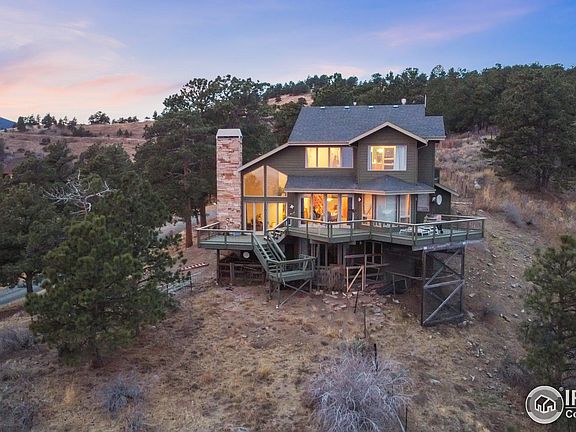 Mountain home on 6.40 acres with fantastic views! The BEST city light and mountain views you have ever seen! This home has an open floor plan and features: bedrooms with walk-in closets, study, game room, workout room, hard floors throughout, steam room in master bath, wired for sound w/ built-in speakers in kitchen and rec room. Incredible deck! Room for horses: corral and 2-stall barn with automatic watering and hayloft. Family room could be 4th bedroom. Beautiful setting amidst towering ponderosa pines and adjacent to miles of open space. Enjoy mountain living with city convenience and minutes to Boulder, Interlocken, Arvada and JeffCo Airport.