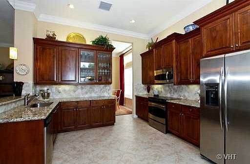This is a great opportunity to live in a new community. Meet new neighbors and be part of a growing community. This bright home has the Vignette package plus all custom-fitted closets, extended patio and beautiful, wide ceiling moldings throughout. The upgraded kitchen has rich looking wood cabinets, a range tower with veneer columns, glass front cabinets, granite countertops, tumblestone marble backsplash, extended snack bar, over and under cabinet lighting and stainless steel appliances including a slide-in range. Tile is laid on the diagonal in the living areas. All closets are custom-fitted. The third bedroom closet is fitted as a clothing closet and additional shelving for office supplies. Numerous hi-hats, stunning ceiling moldings and upgraded bathrooms are just a few of the special features. The patio is the best of 2 worlds. In addition to the screened patio, is an open area for sunbathing. Accordion shutters have been installed. The washer/dryer, dining and great room drapes and the entry foyer fixture are excluded from the sale. All measurements are deemed correct but not guaranteed.