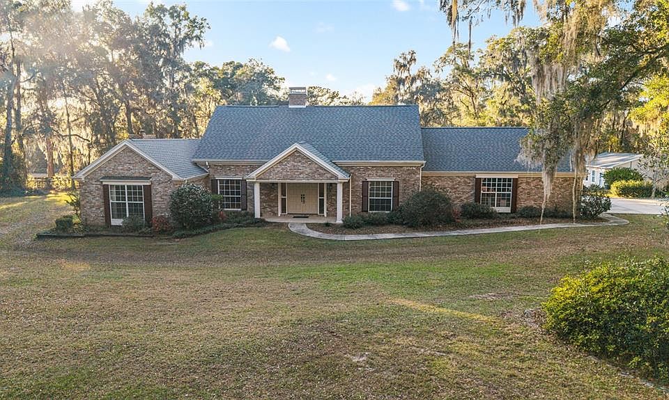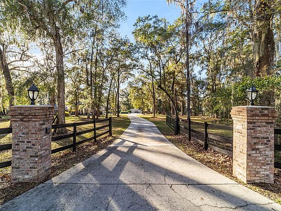 Nestled on a quiet stretch of Shady Road Ranches, this gated estate offers the perfect blend of privacy, beauty, and convenience. Set on just under 5 fully fenced acres, the property features professional landscaping, excellent curb appeal, and an owner-installed garden—ideal for starting a farm-to-table lifestyle or hobby farm. The multi-story 3BR/2.5 bath pool home offers high ceilings, abundant natural light, and an open layout. The main living area features a cozy fireplace and flows seamlessly into the well-appointed kitchen with stainless steel appliances, ample cabinetry, tiled backsplash, under-cabinet lighting, center island, and pass-through window to the sunroom—perfect for entertaining. The formal dining area includes beautiful built-in shelving. New Roof less than 2 years old, new AC in upstairs of main home. The first-floor primary suite is a private retreat with sitting area, fireplace, walk-in closet, and en-suite bath with dual vanities, soaking tub, and glass-enclosed shower. The air-conditioned sunroom includes a wet bar and entertainment space and opens through French doors to the expansive pool deck and sparkling in-ground pool. An upper balcony with exterior spiral staircase overlooks the pool and backyard. Upstairs bedrooms share a bath and provides direct access to the balcony. A private studio-style apartment with kitchen and full bath provides flexible space for guests, in-laws, or home office use. Located minutes from the Florida Horse Park and a short drive to Ocala shopping, dining, medical, and entertainment. A rare opportunity to enjoy peaceful country living with modern comfort and convenience.**
