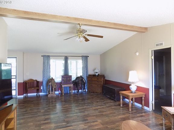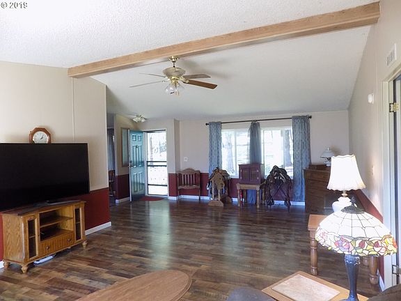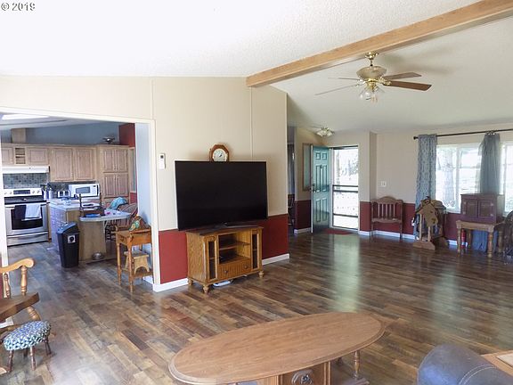 Open and Bright 1991 MFH home sits on 2.01 level acres with an amazing view. Large kitchen with island. Vaulted ceilings, New flooring throughout, updated bathroom. Newer interior and exterior paint. Ductless heat pump, Wood stove. Master bedroom with double closets. Master bath w/dbl sink, garden tub and shower. Property is fenced and X-fenced. 10x20 barn, 12x12 dog kennel, 10x10 pump house with electricity and concrete floor.