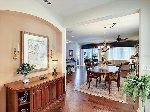 Del Webb Stone Creek ...Maintenance free living in this top of the line designer home! This comfortable Augustus floor plan includes pop up ceiling, granite countertops, wood flooring, Kerastan carpet in the bedrooms. Kitchen includes new stainless appliances, tile backsplash, custom cabinets and spacious breakfast bar. Master bath includes dual sinks, walk in shower and walk in closet. Laundry room includes LG washer and dryer plus wash basin. Step out into the enclosed lanai for privacy and casual lifestyle. New Appliances! Monthly maintenance includes paint and cleaning exterior, roof, yard maintenance, garbage, water and the facilities. The amenities in Stonecreek are incredible. Reflection Bay on 29 acres and is a 60,000 square-foot social and recreational complex with two indoor facilities reserved for fitness and fun activities. Reunion Center is the social area and is the ideal gathering place for activities, club meetings, and events. Truly a resort lifestyle