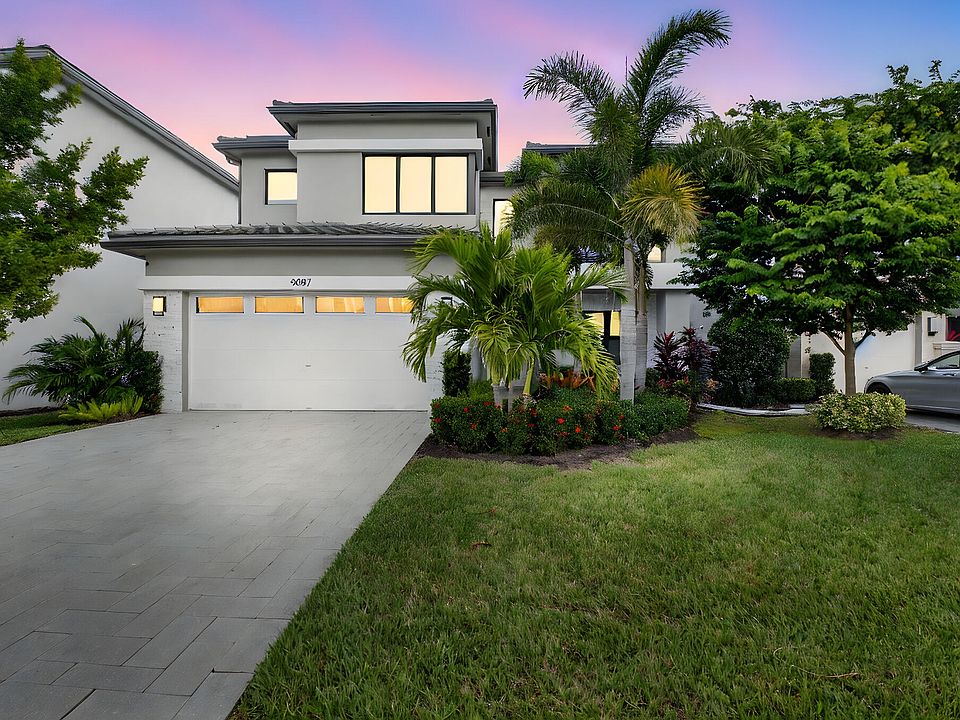Experience refined contemporary living in this stunning residence with a sleek a contemporary look, striking white stone & soft taupe exterior finishes, perfectly positioned on a north-facing waterfront lot offering tranquil water views & exceptional natural light. The well designed home offers 4 bdrms with an optional 5th bdrm, 4 full bths, & 1 powder bath, providing flexibility for family, guests, or a home office. Porcelain tile flooring flows throughout the main level, while plush carpeting adds comfort to the bedrooms. The gourmet kitchen is appointed with quartz countertops, premium KitchenAid appliances, & open family & living rooms-ideal for both everyday living & entertaining. A stylish wet bar adds to the home's entertainment appeal. Upstairs, a spacious loft area & private balcony create inviting spaces to relax & unwind. Enjoy Florida living at its finest with a summer kitchen, heated pool, & fenced yard, all overlooking the serene water backdrop. Additional highlights include a 2-car garage with epoxy flooring, UV-light enhanced air conditioning systems, frog fence, & a well-proportioned 7,484-square-foot lot. This exceptional residence blends modern elegance, thoughtful upgrades, & resort-style livingan opportunity to truly love where you live.