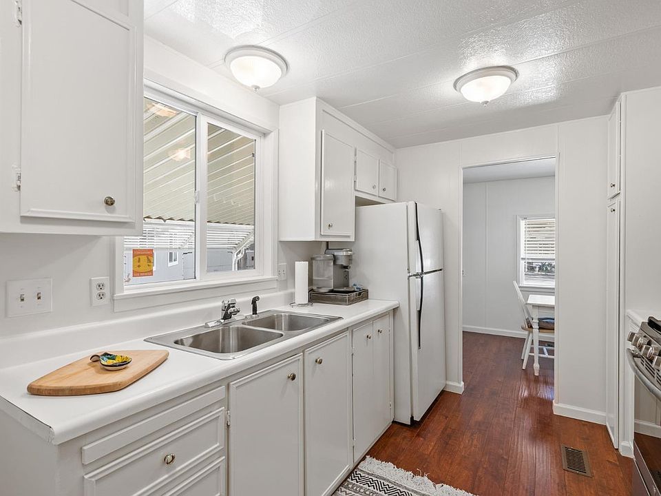 Welcome home to this spacious and bright mobile home in an all-ages park! Perfect family starter home in cul-de-sac which backs up to a beautiful huge park. Fully fenced and gated large lot to let your kids play safely or your pups stretch their legs. The generously sized primary bedroom features a walk-in closet, and the ensuite includes a soaking tub, stall shower and separate vanity counter space. This clean, well-maintained home has fresh interior paint and newer fixtures, with a cherry vinyl plank flooring in main living areas and bedrooms. Rancho Verde Mobile Park includes a Clubhouse, 2 pools, hot tub, basketball court, soccer field, and playground.
