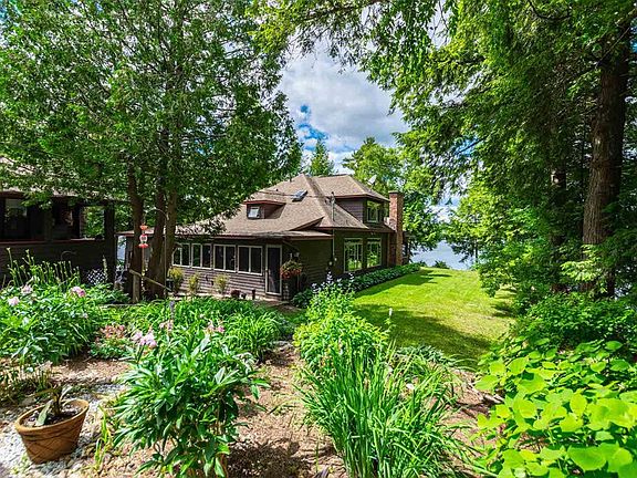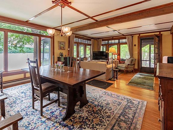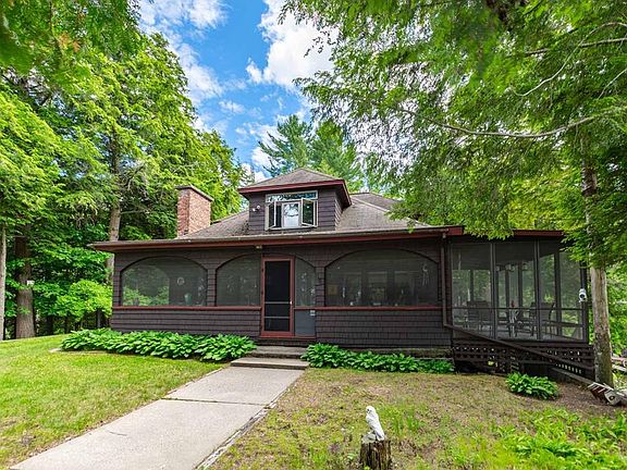 Owls Head Camp, Long Lake. On a private elevated peninsula overlooking Long Lake, Owls Head Camp offers 5 bedrooms, 2.5 baths , spacious screened porches on the eastern Long Lake shoreline.The unique location provides views across the lake to Owls Head Mt. and evening sunsets. The original Craftsman style camp has recent renovations that included a modern kitchen plus 3 bedrooms & bath upstairs.The large open living and dining area overlooks the lake. A peninsula point deck gives panoramic views of the lake. A sandy beach area connects to a swimming dock. A very nice guest apartment is part of the large barn/garage building. The apartment is in use as short term rental. Owls Head Camp, a rare and special Long Lake property.
