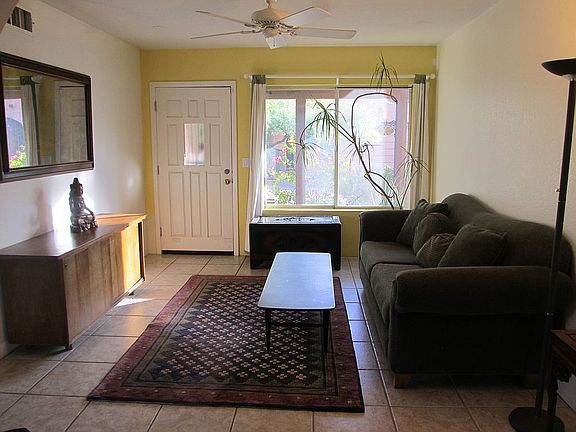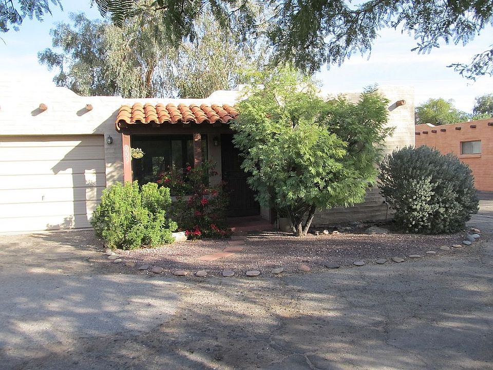 This 2 bd/1bath Santa Fe style condominium is located in a small enclave of 16 units in the Campus Farm neighborhood in Tucson. This is a quiet community, close to shopping/ dining areas and the University of Arizona, with easy access to public transportation and The Loop. This single story unit features A/C and heat, tile flooring, gas stove, ample cabinet space, wireless security system, ceiling fans, lots of windows and natural light, and a private backyard green space with shade trees. This unit also has a single car garage, as well as one dedicated parking spot inside the complex. Per HOA, this community is restricted to owner occupied only. No rentals.