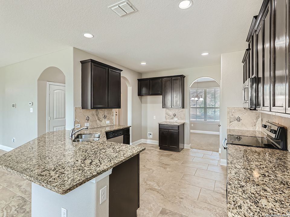 Welcome to 909 Kauri Clfs, a spacious and lovely 2,778 sf, 5/3/1 house in Mesa at Turning Stone. This property is move-in ready and offers an inviting, open floor plan and brand new interior paint! The gourmet kitchen includes beautiful espresso cabinetry, granite counters, decorative backsplash, and stainless appliances. Enjoy meals in the dining room, breakfast area, or at the breakfast bar. The primary bedroom boasts an en suite bath with double sinks, garden soaking tub, separate shower, and walk-in closet. The loft can be used a second living space, office, or game room. The large, private backyard offers plenty of space for outdoor recreation. This location is minutes away from Randolph AFB, I-35, restaurants, and grocery stores. *Click the Virtual Tour link to view the 3D Tour.