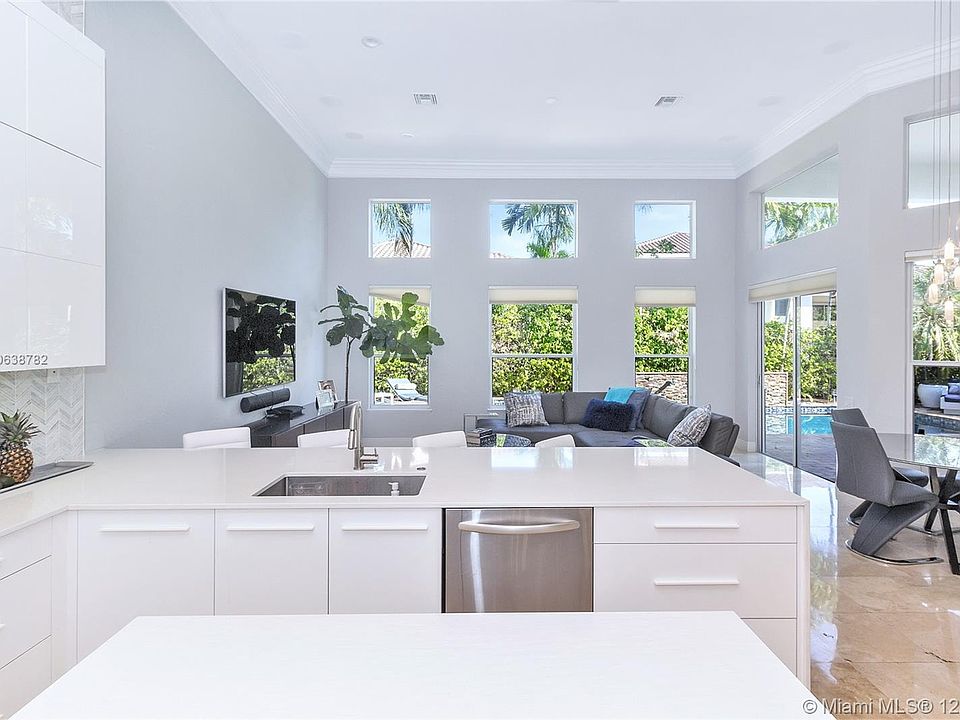 JUST REDUCED $50,000! Completely on trend, Barcelona Model in Harbor Side. Home has been completely remodeled from top to bottom, including brand new chef's kitchen with state of the art SS appliances, white lacquer double high cabinetry with soft touch drawers, quartz countertops, gas range, double oven, bar area, large pantry, formal dining room, remodeled master bedroom and bath w/ floating tub, separate shower, towel heater. Ground floor master with three bedrooms upstairs, two with en suite bathrooms. Garage has been converted into living space and currently serves as a playroom/lounge. Pool has been re-marcited & includes a fountain feature. Harbor Side is the closest part of Harbor Islands to the park, club house, and houses of worship.