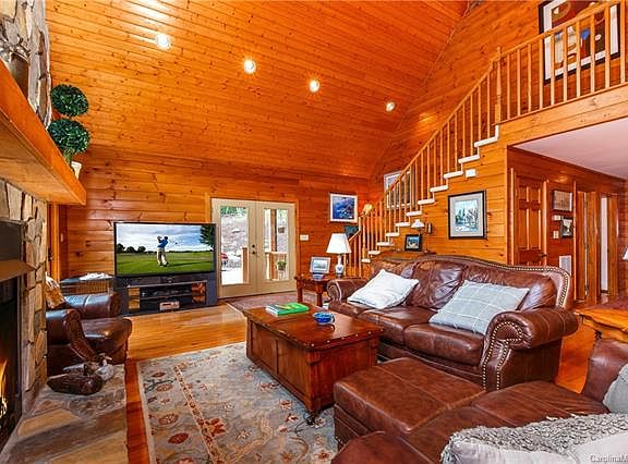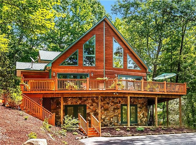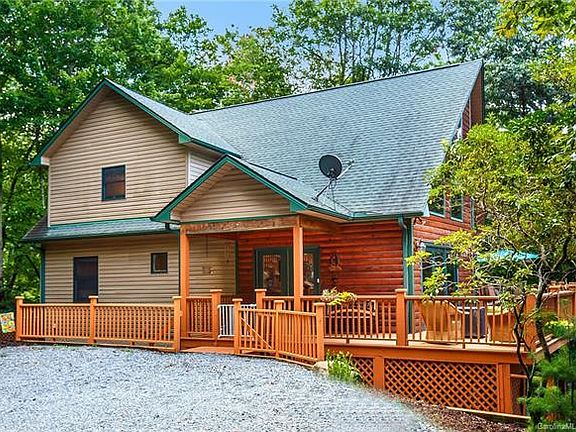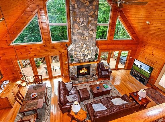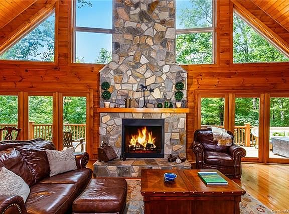 Dramatic mountain ambiance fills this spacious custom log-sided home. Located on a private, landscaped double lot conveniently located near the clubhouse. Open floor plan features great room with 30' vaulted wood ceiling, 30' stone fireplace, and 2 story wall of windows. Custom kitchen includes center island, breakfast bar, quartz countertops, stainless steel appliances and new gas cooktop. King-sized master bedroom with vaulted wood ceiling has been privatized by the recent addition of a stunning crow's foot and glass wall above double door loft entry. Owner recently combined two lots and extended the driveway for EZ step-free access to main level. 138' wrap around deck offers seasonal lake views. Completely finished lower level with gas fireplace, family room, full bath, bedroom, office, and interior storage. Walk to Lake Tiaroga, golf, heated pools, tennis, pickle ball, and newly renovated Connestee Falls clubhouse. Buyer to pay one time Amenity Fee of $8000.
