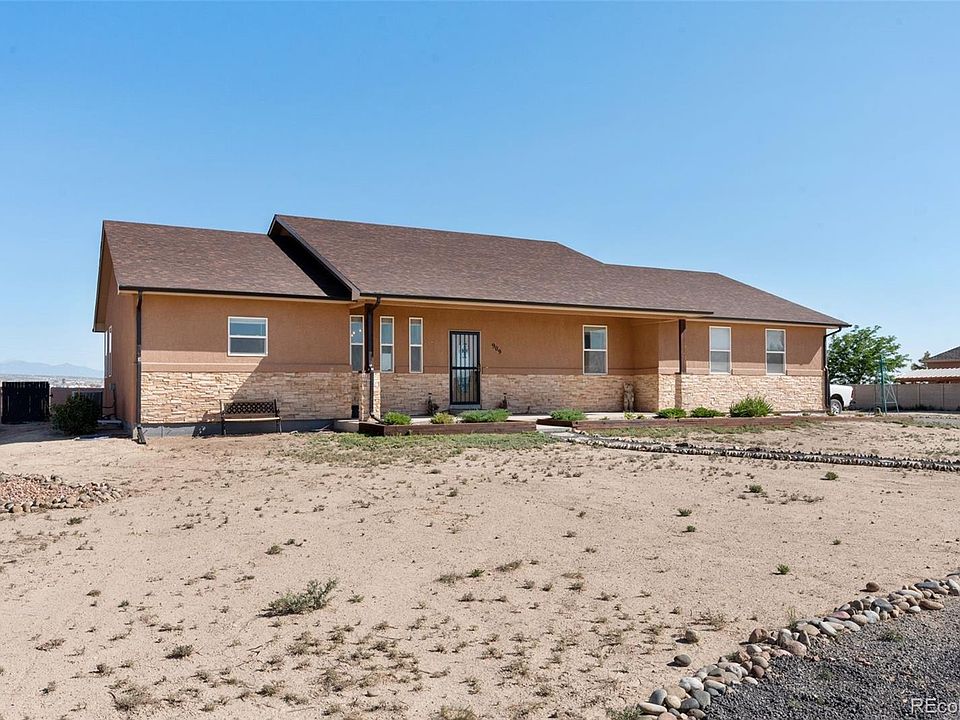Gorgeous ranch style home on almost two acres with unobstructed mountain views! Beautifully finished stucco exterior, natural stone veneer accents complete with covered front patio! On the main level youre welcomed by bright open living space, walk out access to your covered rear patio, secluded back yard, and unobstructed views of Pikes Peak. The large walk through kitchen and dining area has high end wood look tile, black stainless steel appliances, and upgraded cabinetry! Also on the main level is your spacious master bedroom, ensuite master bath, and separate walk out to your covered back patio! Across the living room you'll find two great sized bedrooms, full bath, entry to your attached 3 car garage and one of the laundry rooms! The basement boasts high ceilings, wet bar, two living spaces, surround sound wiring, full bath, two additional bedrooms, giant finished storage room and second washer/dryer!!