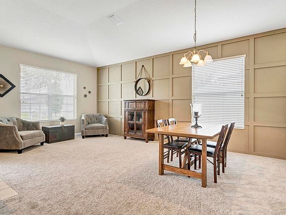 This 4/2/2 home offers a light & bright open floor plan w/ high ceilings, large formal dining room/living room with a beautiful coffered accent wall. The kitchen is open w/a large eat in area and spacious family room overlooking the lanai through triple sliding door . You'll enjoy entertaining guests, baking or making crafts on the expansive center island counter top. There are wood cabinets,tiled floor,pantry & timeless black appliances.Master BR suite features lge w/i closet, dual sinks, a separate w/i shower & garden tub. 3 additional spacious bedrooms on opposite side of house. Inside laundry 2 car garage,fenced yard. The family friendly community has pool, resort atmosphere ,sidewalks & playground. 1 minute to Suncoast Parkway,E-Z commute to Tampa. Professional Photos coming soon.