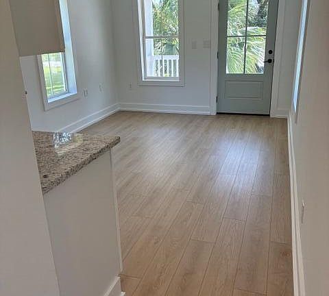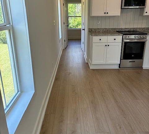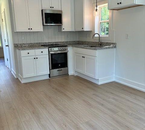 Granite counters, under mount sink, stainless electric stove, built in microwave, 2 mini splits for air & heat, washer & dryer connections. Lots of storage underneath.