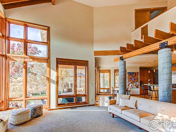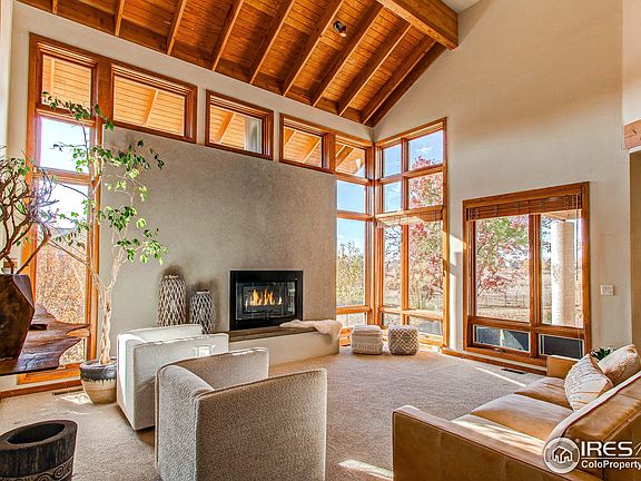 Motivated seller! New roof! Owned solar panels! You'll fall in love right away with this beautiful David Hueter custom home, perfectly situated on a spacious nearly 1/3 acre lot backing to mature trees, open space, and Fossil Creek with incredible mountain views. Vaulted, beamed ceilings greet you, with one of a kind custom concrete pillars, a central fireplace, and tons of windows letting an abundance of natural light and the lovely views. The well-appointed kitchen features stainless steel appliances, including sub-zero refrigerator, built in oven, gas cook top, granite and concrete island. Custom paint and beautiful hardwood floors flow through entry, private study, dining area and kitchen. Upstairs is just as impressive, as it overlooks the living space with floor to ceiling windows. 2 newly painted bedrooms provide a spa-inspired relaxing space with a freshly renovated bath. The large private primary suite boasts a 5-piece bath, large walk-in closet, and picturesque mountain views. The basement offers more exceptional living space with a large family room, 4th bedroom and 3/4 bath and substantial storage space + radon mitigation system, and room to expand. Additional home features include; owned solar panels, lush mature landscaping, a private covered patio, gas stub out, and a freshly finished epoxy garage floor. There is so much to appreciate about this home, and all in an incredible location near Fossil Creek Park, Werner Elementary School, Southridge Golf Course and the Harmony Corridor.