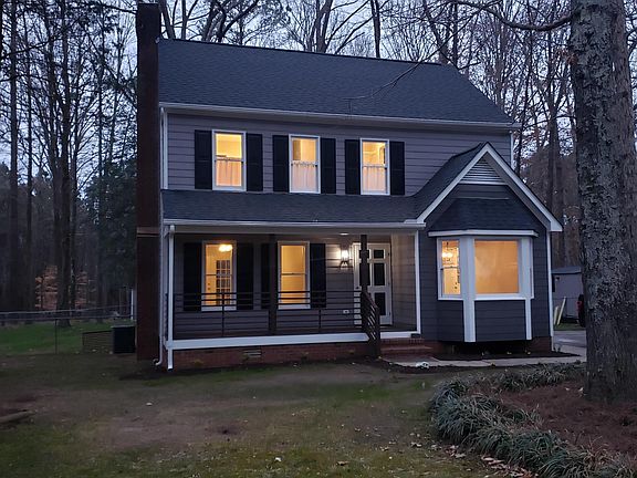 Beautiful renovated home dead end street backs to Richland Creek ES property in Wake Forest. This 2 story home has new plumbing, LVP flooring downstairs New Kitchen cabinets, granite ct and backspash. All new light/plumbing fixtures. Both bathrooms new tub(Master walkin shower)vanities, toilets. New paint inside/out, new roof, new H2O heater, Insulation in attic/crawlspace replaced. Large backyard, fenced-2 sheds(1wired),playhouse. Covered front porch/deck with patio pavers. New stainless steel appliances