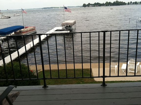 2nd floor condo has best long view of Wawasee with balcony. Has a large side yard, common lakefront patio, piers. Recently remodeled. New flooring, paint, stainless steel cabinets.