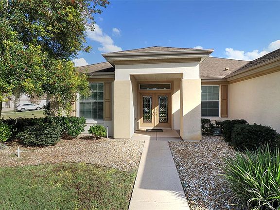 Not too big and not too small. Designer double door entry. This concrete block and stucco Hanover has an open floor plan with kitchen, breakfast nook and living room combo. Kitchen features double pantries, breakfast bar, stainless steel appliances with Maple cabinetry extension into the breakfast nook area for additional storage with built-in desk. Formal dining room. Ceramic tile in heavy traffic areas with bedrooms being carpeted. Inside laundry room conveniently located to both guest rooms. Primary suite features tub and shower, double vanities, walk-in closet as well as a water closet. Enclosed lanai (acrylic windows) with vertical blinds and vinyl flooring. Extended two car garage (privacy screens) plus golf cart garage with overhead hanging racks and utility sink. HVAC 2015. Home has been re-piped. Private irrigation well. Exterior repainted January 2022. Tankless gas water heating system March 2022.