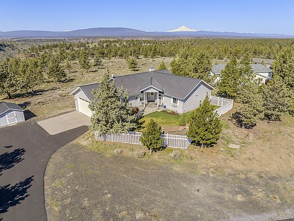 Single level home on 1.80 acres with incredible Cascade Mtn. Views, backing 2700+ acres of public land. Fabulous 30' x 36' RV garage built in 2020 includes 2- 14' pull-through doors, 1- 10' overhead door, 15' x 35' insulated office/garage, Mitsubishi split system heat pump & AC, 50-amp RV plug, 16' x 20' storage loft area. Living Rm has vaulted ceilings, large windows, gas fireplace, granite mantle & surround. Open dining area, sliding glass doors offer access to the huge covered back deck. Center island kitchen, granite counters, backsplash & newer SS appliances. Spacious Kitchen with ample cabinetry, walk-in pantry & breakfast bar. Good sized primary suite, double doors, walk in closet, tile counter, dual vanity & sitting area. Charming office/den w/pocket doors, arched doorways, custom window blinds. New asphalt driveway & exterior paint 2022, water heater 2023. Nicely landscaped front yard, sprinklers, double gates, white picket fence. Down the street from 5-acre Panorama Park.