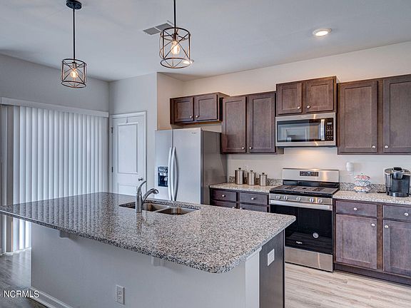 The Kerry plan is a beautiful one story home with a two-car garage. Home is located in Porters Neck/Scotts Hill area, close to beach, shopping, restuarants, and sits in a small quite neighborhood. This home has many upgrades including; gutters, fenced in back yard, screened in back porch, 12x14 back yard patio, new grass in back yard, updated light fixtures, ceiling fans, extended front walkway and storm door to name a few. At the front of the home are two quest bedrooms with a full bathroom. As you walk through the foyer, the family room, gourmet kitchen, and dining room combine for a truly open concept home. At the back of the house, the private Owners Suite is complete with walk-in closet, and on-suite bathroom. The home has granite and cultured marble square bowls in the bathrooms. Home comes with smart home features included! ''This property is protected by a warranty through 2-10 Home Buyers Warranty and is available for purchase at closing. If not purchased, the warranty will expire at closing and the property will be unprotected.''