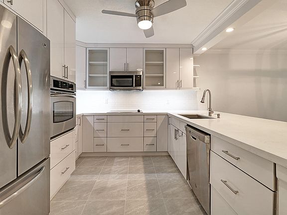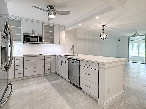 Come see this absolute gem 2 bed / 2 bath corner villa in move-in condition with major interior renovations located at Town Villas in the heart of Boca Raton. This gorgeous residence features tons of windows and natural light with beautiful garden views on private corner lot, open living and dining room with new tile flooring throughout, remodeled modern South Beach inspired kitchen with glass inlay premium cabinetry, quartz counters, stainless steel GE Profile wall oven, cook top, double bowl and under-mount sink. Bathrooms feature same sleek modern design completely renovated from top to bottom with custom high-end finishes and upgrades. SEE SUPPLEMENT.