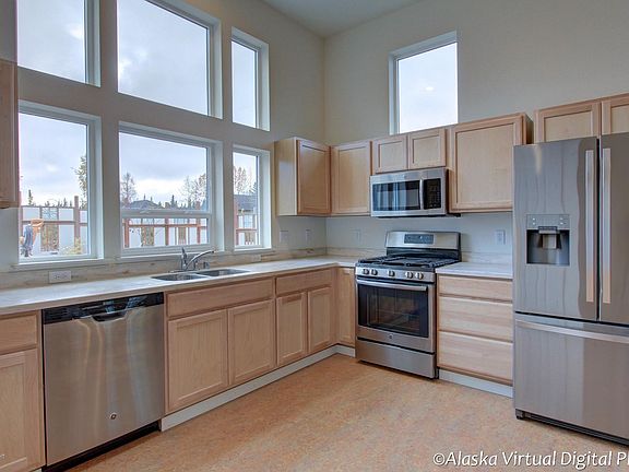 Enjoy the Alaskan sun! Large South facing windows and vaulted ceilings. Beautiful & inviting kitchen, dining and living areas featuring radiant heat. Master bedroom, two additional bedrooms and stairway feature Alaska kiln-dried birch. South-facing private back yard fenced with glass blocks and acrylic panels, new deck, apple and cherry trees. 6 star energy rated with 20-35% less usage! (see more)