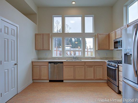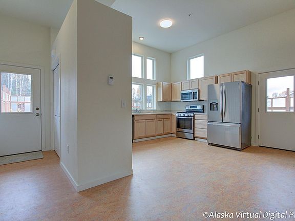 Enjoy the Alaskan sun! South facing townhouse style condo w/ 3 bedrooms, laundry, & main bath upstairs; open concept living/dining & kitchen (and bathroom!) downstairs w/ two entrances. Huge windows and vaulted ceilings (cellular blinds added after photos were taken--blackout blinds in bedrooms). Heated GARAGE! Beautiful & inviting kitchen, dining and living areas featuring radiant heat. (SEE MO