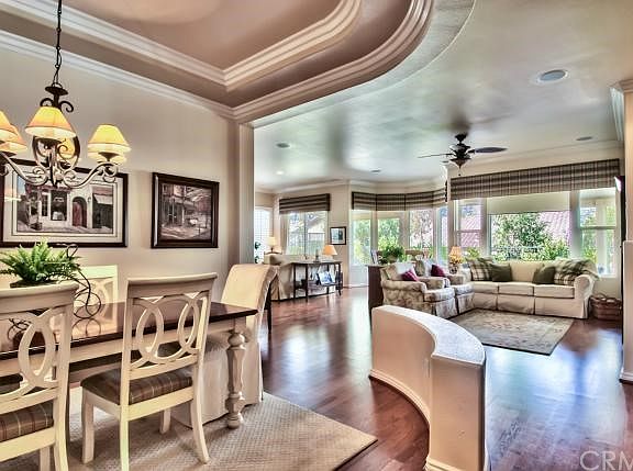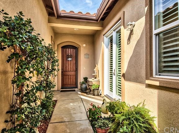 Trilogy at Glen Ivy is a gated, active adult golf course community nestled at the base of the Cleveland National Forest. This charming Chaparral model has numerous upgrades including granite counter tops, stainless steel appliances, hardwood flooring, pull-out kitchen shelves, plantation shutters, surround sound, crown molding and a spacious 3-car garage with epoxy finish. The formal dining room, with coffered ceiling, flows into the vast great room which features both an entertainment area on one side and a cozy sitting area with fireplace on the other and the bay window is perfect for a game table or casual dining. The lovely covered patio and backyard are accessible from both the great room and the master suite which offers a coffered ceiling, large walk-in closet, soaking tub, split sinks and vanity area. A spacious guest room, full bath and office/den area with french doors to the front entry complete this beautiful home. The golf course community amenities include indoor and outdoor pools and spa, tennis courts, club house with billiards room, art studio, card rooms, banquet facilities, gym, dance/yoga studios, library, bocce ball and a limitless offering of social clubs and classes to fit every taste. You'll love the Trilogy lifestyle!