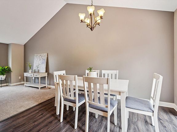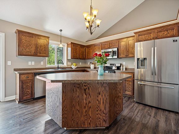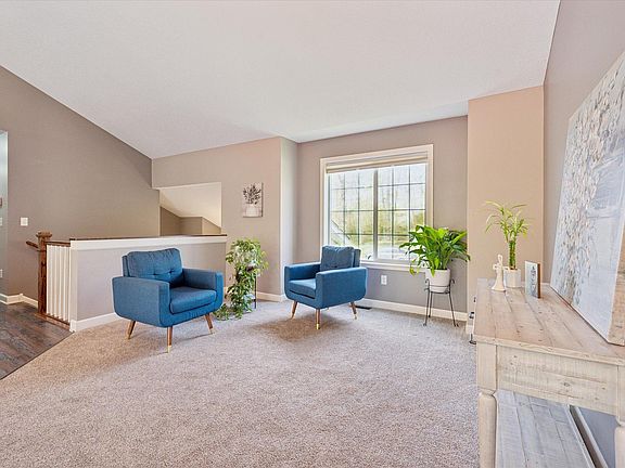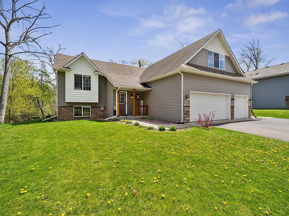 Welcome home! Step inside froun your 3-car garage and be greeted by double high ceilings. The main floorfeatures an open layout with a kitchen, family room, and eating area that seamlessly connect to the deck,perfect for entertaining. The upper level, finished above the garage, serves as a private owner's suitewith an en-suite bath and walk-in closet. The lower level boasts a beautiful bar area, gas fireplace,full bath with jetted tub, a fourth bedroom, and a spacious laundry room. Walk out to your backyard patiosurrounded by woods for ultimate privacy. Situated on a dead-end street in a newer development, you’llenjoy tranquility while being close to highways and just minutes from downtown Chisago City.Explore parks like Ojiketa Regional Park with its 70 acres of natural beauty, local wineries likeWineHaven and breweries like Uncommon Loon Brewing Company. This 4 bed, 3 bath home offers the perfectblend of seclusion and convenience.