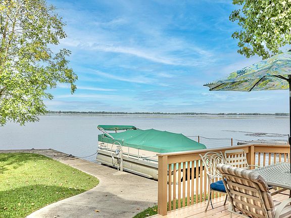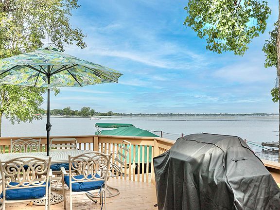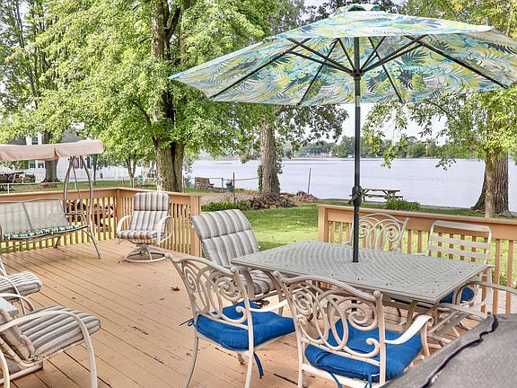 Beautiful well maintained home on Orchard Island with a west facing waterfront! As you walk in the front door, you have breathtaking views and sunsets from all rooms and windows. Open concept floor plan that features a large family room with a gas fireplace, vaulted ceilings with skylights, and an eat-in kitchen that has plenty of cabinet space filled with all of the necessities. First floor bedroom and bath is handicap accessible. The second floor offers a large master bedroom and bathroom, a loft, and a third bedroom with bunk beds. The outdoor living space boasts a large deck that is great for entertaining, fire pit at waters edge, shed and a yard with plenty of space for outdoor fun and games. 72' of waterfront with a boat slip and lift. The oversized 26x23 detached garage has tons of storage for all of your water toys. Flanking the garage is a 14x8 sound proof room. Full appliance package including washer and dryer. Make this your new getaway at Indian Lake!