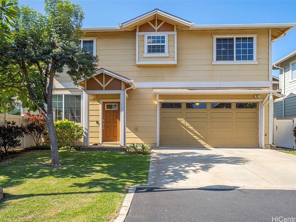 Open air with no home directly behind you for added privacy! Beautifully maintained 3 bedroom, 2.5 bath home with attached 2 car garage plus a large driveway for 2 additional cars (4 total), excellently located within Laulani-Tides in Ewa Gentry. Gorgeous low maintenance luxury vinyl flooring throughout the downstairs. Home boasts a large primary bedroom with dual vanities and a huge walk-in closet with closet system, There is a 16 panel leased PV system plus backup battery to help save on electricity costs. Central A/C has been replaced in 2021 plus a new solar water heater installed in 2020. One of the larger fenced in yards in the development! Excellently located near parks, shopping, restaurants, beaches, and much more. Neighborhood amenities include BBQ area and pool! Home is in move in condition! Put this on your must see list! One or more photos virtually enhanced.
