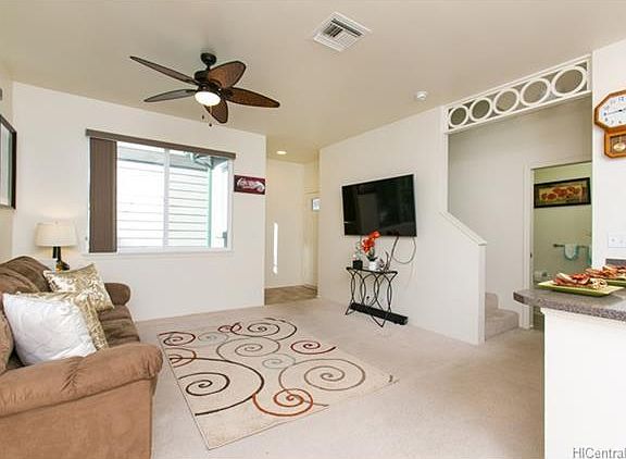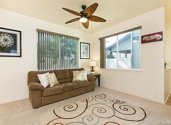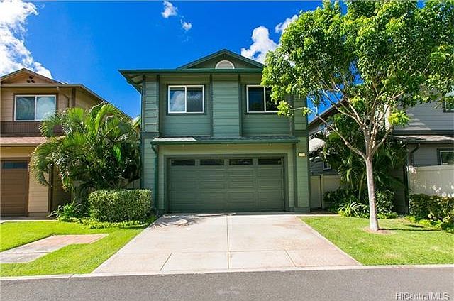 Don't miss the opportunity to own this 4 bedroom 2.5 bath home in Laulani Trades. Sale includes 22 PV PANELS (owned) and solar water heater. Wow! a huge savings on electric bill! Home is with central AC, corian counter,walk in closet, customized blinds in living room and dining area. Extended covered lanai to sit and relax. Conveniently located in the back of Laulani Shopping Center. Walk to community swimming pool, cabanas and clubhouse. Extended driveway for extra parking and lots of guest parking .