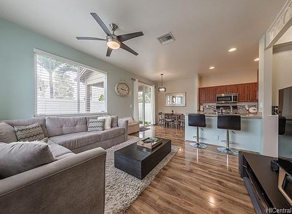 You will enjoy this immaculately maintained home, highly prized corner lot, single-family detached home located just walking distance from Laulani Village shopping center. This 3 bedroom, 2-bathroom home has a 2-car garage with extended drive way space for additional parking, spacious maintained lawn with covered lanai, 5 owned photovoltaic panels and solar water heater. Natural wood-look laminate floors throughout downstairs, a modern gourmet kitchen with recessed lighting and stainless steel appliances. Imagine cuddling up to a cozy living room on a Sunday morning with a favorite book and a warm cup of coffee. Make this holiday season a special one for you. This home could be yours before the NEW YEAR! Call now!