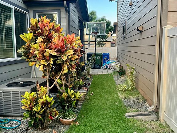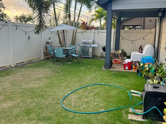 Welcome to Ewa Gentry! This lovely 3 bedroom, 2.5 bath single family is located behind Laulani Shopping Center Village. This home features a large primary bedroom with a walk-in closet, and ensuite bathroom with dual vanity sinks, a spacious upstairs loft area. There's a spacious yard with no back neighbors, covered lanai, washer and dryer, central AC to keep you cool, solar water heater, and PV (Photo Voltaic) "owned" Solar Panels (15 panels); 2 car garage with driveway for 2 additional cars. Close to schools, golf courses and shopping center. Only 13 miles to Scholfied Base and Joint Base Pearl Harbor. Pet will be considered. 12 month lease; water included; owner pays for Electricity and responsible for yard maintenance.