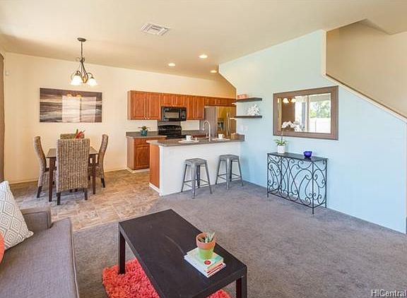 Don't miss this opportunity to own one of the largest floor plans in the Trades! This plan 4 has an extended master retreat that could be used as a 4th bedroom, a large walk-in closet and soaking bathtub. This home also features an upstairs loft, photovoltaic, 3 full baths, a large pantry closet, stainless steel appliances, corian counters, central AC, security alarm system and 4 parking. Located at end of the development with no rear neighbors. Walking distance to Laulani Village Shopping Center and close to guest parking. Grill & gather in the community BBQ area and cool off in the pool. Maintenance fee covers water, sewer, exterior homeowners ins, landscaping, pool, BBQ and other common areas.