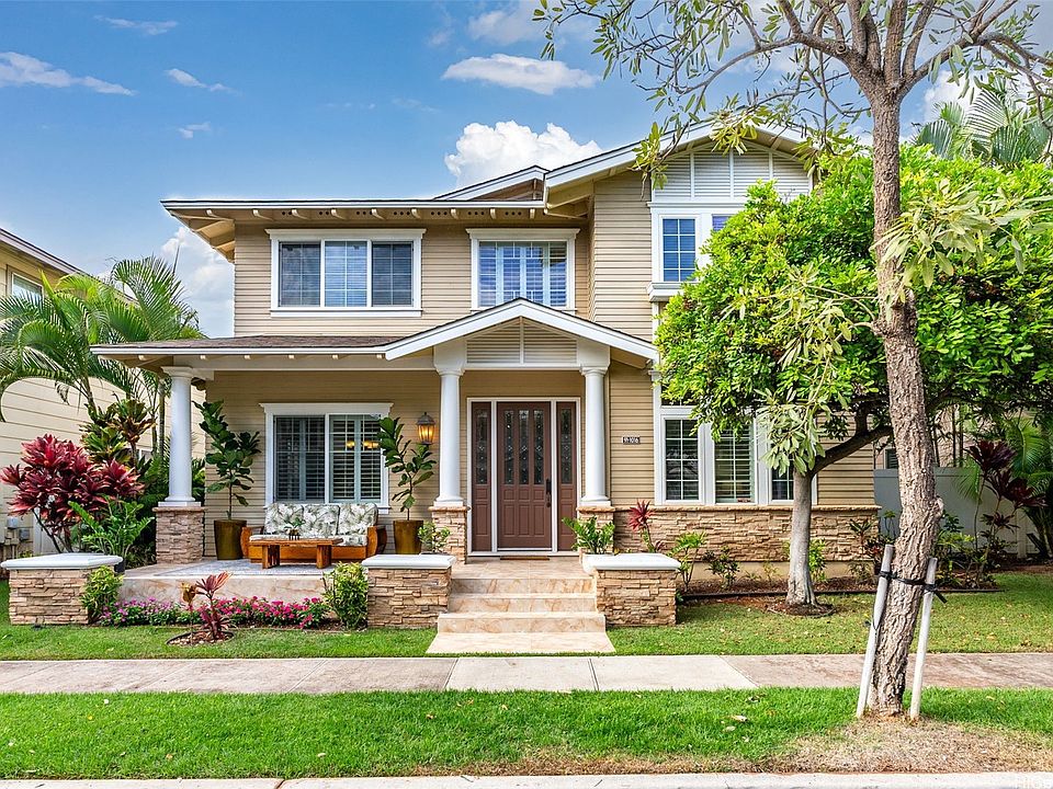 *Huge $65k price improvement! Updated single family residence in the desirable Ocean Pointe neighborhood. This stunning 5bed, 3bath, 2,852sqft residence offers both curb appeal and modern updates, starting with a charming front porch w/ updated tilework, lush tropical landscaping, and cozy seating area. Inside is light-filled w/ soaring 18-ft ceilings and an open, flowing layout. Main level features luxury laminate floors and updated kitchen w/ sleek quartz countertops, island w/ waterfall edge, new appliances, quartz backsplash, and warm-toned cabinetry with updated hardware. Modern pendant lighting adds to the inviting ambiance, while plantation shutters throughout enhance privacy and style. Built-in living room cabinets provide storage and a polished look. Upstairs, the luxurious primary suite includes a spa-like 5pc bath w/ freestanding soaker tub, dual sinks, and quartz tile shower. Secondary bedrooms are bright and spacious. Leased solar w/ Tesla packs, and a 2-car garage plus carport. Outside, enjoy a private, landscaped backyard ideal for entertaining or relaxing. Low $133 HOA. A sweet combo of modern luxury with island living—don’t miss your chance to make it yours!
