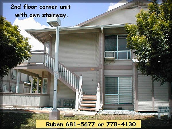 Excellent Condition, 2/2/2 partly furnished private end unit - rarely available, 2 A/C, 4 ceiling fans, 2 bedroom, 2 full bath, gas stove, blinds, washer and dryer, GATED COMMUNITY, recreational ctr. w/ large pool / BBQ / party area. 2 parking (covered parking just below the balcony + one open + guest parking), upstairs unit with private entry and a LARGE balcony. Just Painted & Cold 18,000 Btuh A/C Unit. Conveniently located near mailbox, pool, water facilities to wash your car and trash bin. One mile from Starbucks, Foodland, Jumba Juice, Longs Drugs, Block Buster, Subway and banks. Near bus line, jogging, biking, park, shopping, schools, 2 miles from Barbers Point, young community in growing area. Near the new North/South Road to Ewa Beach. About 1 mile from the new shopping center that is being built. http kamakanaalii.com/#ournews About 2 miles from University of Hawaii's new West Oahu campus. About 3 miles from White Plains Beach. Rental by owner no middle person to deal with. Includes Water. ** NO PETS, NO SMOKING ** NO SUB-LEASING ** Available NOW.. Call 808-778-4130 (Leave a message).