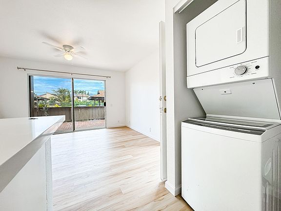 Newly renovated unit located in modern and desirable Ewa Beach's Palm Villas! This one-bedroom has one covered parking, and a window A/C. Open lanai is perfect for enjoying meals outside. Unit includes washer and dryer. This 1st floor unit is bright and open and a ceiling fan in helps keep the main room cool. Home is conveniently located steps away from great recreation area including swimming pool. Well maintained Palm Villas is located in the desirable modern and residential town of Ewa Beach with walking paths, benches, and parks located throughout community. Very close to shopping, restaurants, elementary school, and Ewa Beach Park and Ewa Beach Community Park. Pearl Harbor/Hickam 15 miles away, Schofield 13 miles away. Water and sewer included with monthly rent. Rental is internet and cable ready. Small pet (dog under 40 lbs. or cat) with pet deposit (security deposit + $1,000) and no smoking. All prospective tenants above the age of 18 must fill out an application. Credit check required.