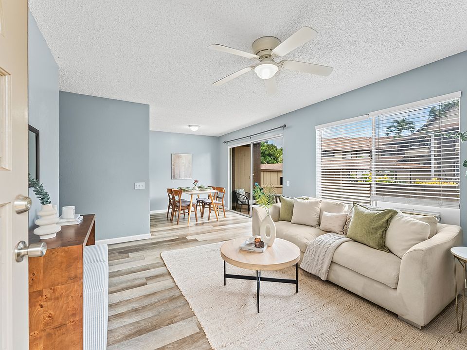Welcome to this stylish 2-bedroom, 1.5-bath townhome offering comfort and convenience. This is a ground-floor unit with yard that features a spacious 250+ sq. ft. lanai-perfect for outdoor relaxation. Enjoy luxury vinyl plank flooring, soft closure kitchen cabinets, quartz counter tops, a kitchen sink, dishwasher, and microwave. With 716 sq. ft. of well-designed space, every room has A/C for year-round comfort, plus an in-unit washer/dryer for convenience. Two assigned parking spots (one covered) make parking easy. Enjoy community perks like a pool, and benefit from quick access to the mall, freeway and bus transportation.