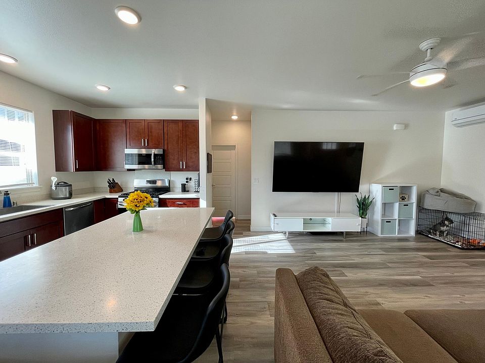 You will love this desirable and rarely available single level home in Hoopili, available for move in October 1st! Recently built in 2019, this Plan 7 model features an open concept living area, fenced backyard, and a spacious covered patio, ideal for entertaining or relaxing in the evenings. Enjoy vinyl plank flooring throughout, white baseboards, low maintenance astro turf backyard, stainless steel appliances including gas stove, split A/C and ceiling fans in every room, tankless gas water heater, and more. Home includes yard service and you will save on electricity costs thanks to 24 PV panels with two Tesla power walls. Hoopili is a wonderful up and coming community with a recreation center & pool, plus multiple parks and playgrounds. Request your showing today! LEASE TERMS: - Available for move in October 1, 2024 - Seeking 12 month lease - Rent includes yard service - Tenant to pay for all utilities (water/sewer, electricity, gas, cable/internet) - Dogs may be negotiable, but sorry no cats - $25 application fee to include credit & background check
