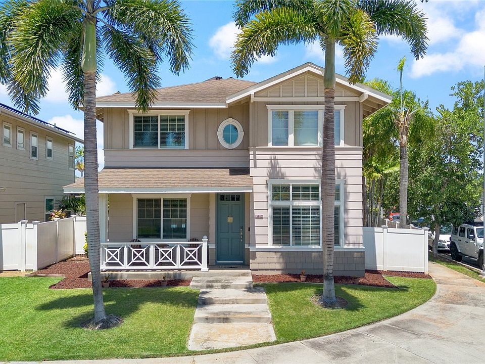 ***VA Assumable Rate at 2.75%***Gorgeous 4-bedroom, 2.5-bath home situated on a corner lot in the sought-after Ocean Pointe community! The property features an open layout with impressive 20 ft high ceilings, newly installed LVP flooring, and a freshly painted interior. It includes dual lanais, with the fourth bedroom featuring French doors, which can alternatively serve as a formal dining room. The home is equipped with central air conditioning, fully owned photovoltaic panels (12), a solar hot water system, and an attic fan package, all contributing to reduced energy costs. Additional amenities include two living room areas, a vaulted master suite with an en-suite bathroom that includes a soaker tub and walk-in closet with built-ins, an in-ground sprinkler system, and a two-car garage. The large, privately enclosed backyard with a covered lanai provides a perfect space for relaxation. Located just 5 minutes from Wai Kai surf park, within walking distance to schools, close to shopping centers, and near KMA mall.