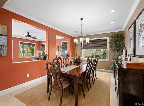 Gorgeous golf course frontage Model 60.40 dream home in Kuapapa at Hoakalei. This luxury home has 5 bedrooms, 4.5 bathrooms & a magnificent open concept floorplan perfect for entertaining and relaxing at home. Beautiful crown molding throughout the first floor & master bedroom, fabulous kitchen area boasts with granite counter tops, gorgeous backsplash, newer high-end stainless steel appliances & beautiful cabinetry. First floor bedroom suite is great for guests. The second floor master suite has custom closet organizers for his & hers closets. All bedrooms have ceiling fans, custom made window coverings throughout the house, plantation shutters, and alarm system is already installed, no details were spared. Home has access to the private Wai Kai Lagoon club and community pool area.