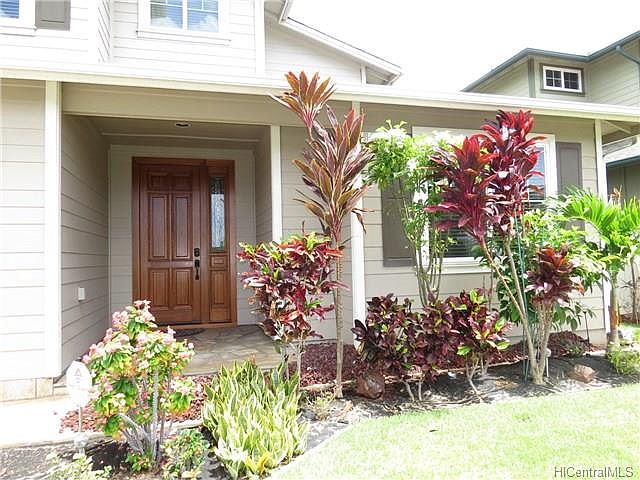 Beautiful 4 bedroom/3-full baths with 9 ft ceiling, covered lanai and professionally landscaped yard. Vinyl plank wood look flooring thru out and tiled floor in kitchen and baths, for easy maintenance. Upgraded kitchen with corian counter top and stainless steel appliances. Built in storage cabinets in garage, ceiling fans, central AC, solar water heater and 7 photovoltaic panels to save on electric bill.Short walk to Laulani Valley Shopping and short drive to the new shopping ctr of Kamakana Alii, Kapolei shops and to Ko'olina Disney Resort. Owner is in process of installing vinyl plank floor thru out. More pictures to come.