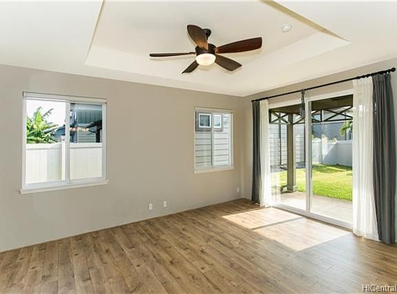 Stunning 4 BR 3 BA detached single family home in EXCELLENT CONDITION located in Ewa Gentry - Sandalwood. It features open floor plan with beautiful hardwood laminate flooring throughout the home added in 2016. There is a bedroom, full bath and the laundry on the main floor. 3 bedrooms upstairs along with loft area. Professional paint in neutral tones throughout, stainless steel appliances, custom blinds, PV panels for cheaper electricity, fully fenced in. Yard maintenance INCLUDED in rent. Spacious 2-car garage and driveway parking along with street parking. Close to schools, shopping centers, restaurants and Ka Makana Alii shopping mall. NO SMOKING, small pet negotiable.